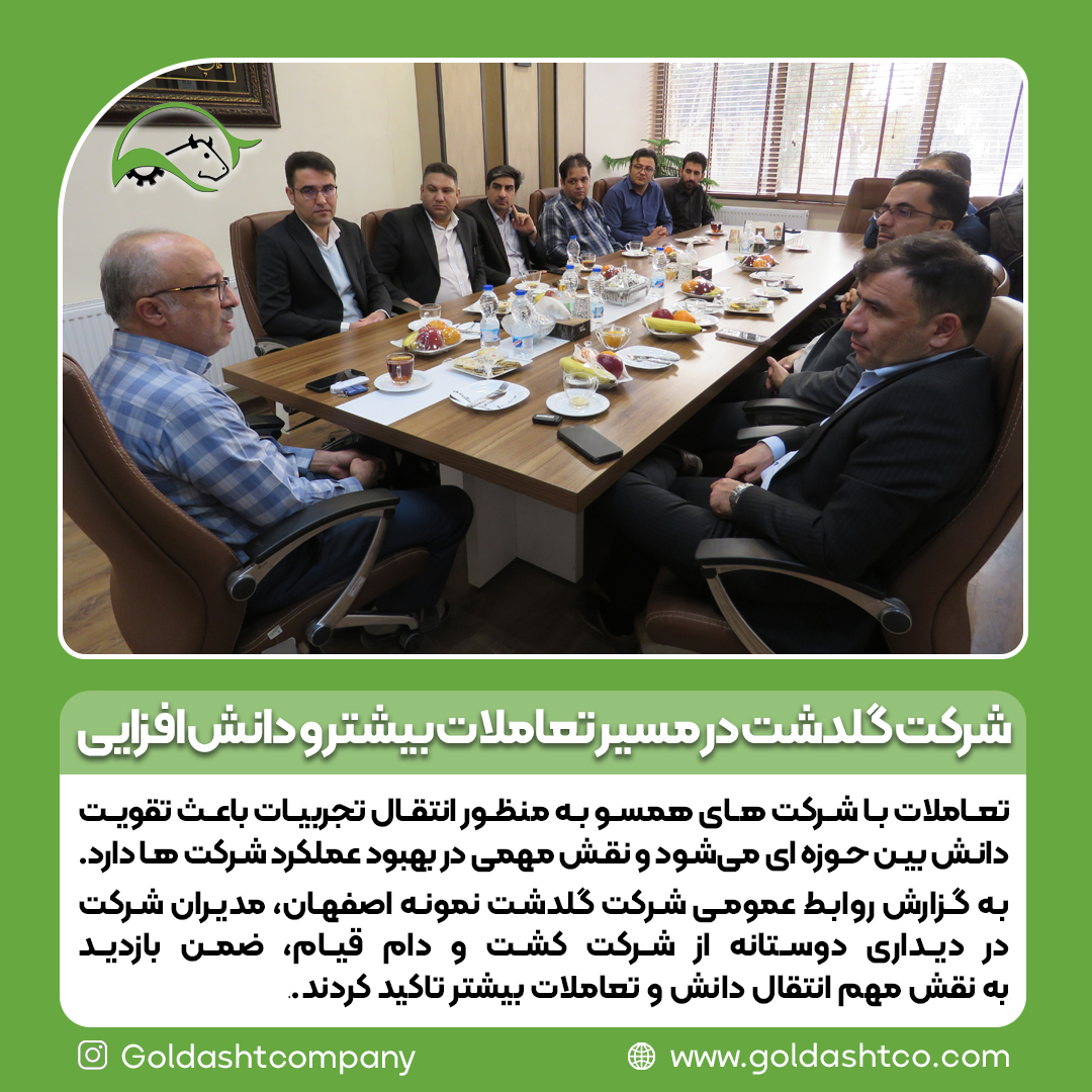 تعاملات با شرکت های همسو به منظور انتقال تجربیات باعث تقویت دانش بین حوزه ای میشود و نقش مهمی در بهبود عملکرد شرکت ها دارد. به گزارش روابط عمومی شرکت گلدشت نمونه اصفهان، در مورخ 21 آذر ماه 1402مدیران شرکت در دیداری دوستانه از شرکت کشت و دام قیام، ضمن بازدیدبه نقش مهم انتقال دانش و تعاملات بیشتر تاکید کردند.